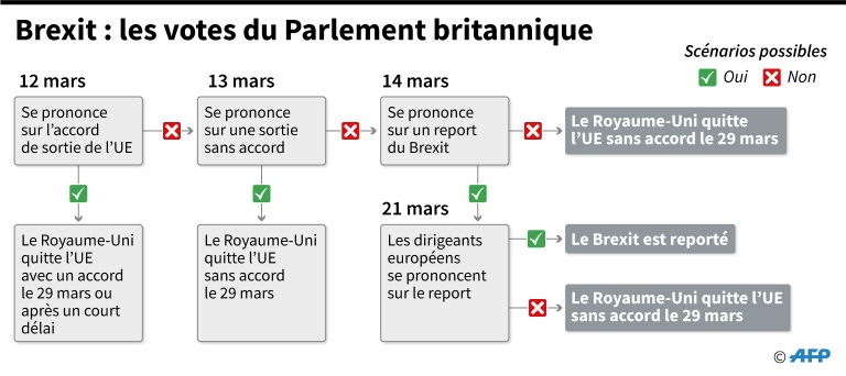 Si l'accord devait être rejeté, les députés voteront mercredi sur la possibilité de sortir de l'UE sans accord, un scénario redouté par les milieux économiques. De nombreux députés s'élèvent contre, mais certains jugent qu'"une absence d'accord vaut mieux qu'un mauvais accord". Si cette option est exclue, le Parlement votera à nouveau jeudi sur une proposition de report "limité" du Brexit. Les 27 devront toutefois donner leur accord à l'unanimité et les dirigeants européens ont prévenu que toute demande en ce sens devrait être dûment justifiée.