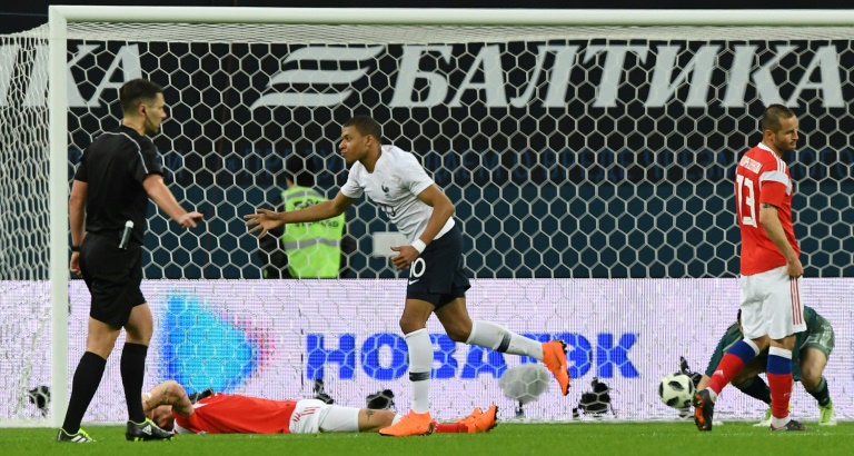 A la mi-temps du match amical contre la Russie, l'équipe de France menait 1-0 grâce à un but du Parisien Kylian Mbappé à la 40e minute, mardi à Saint-Pétersbourg en match de préparation au Mondial-2018.
