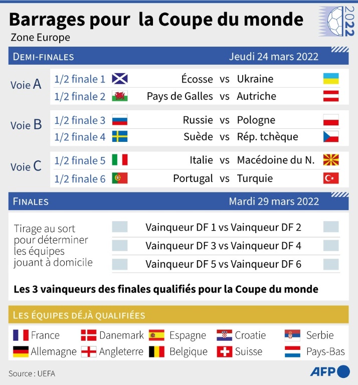 Le Portugal de Cristiano Ronaldo aux prises avec l'Italie championne d'Europe en titre: au moins l'un de ces deux mastodontes ratera le Mondial-2022 au Qatar puisque le tirage au sort des barrages, vendredi, les a placés dans le même mini-tournoi à quatre fin mars.