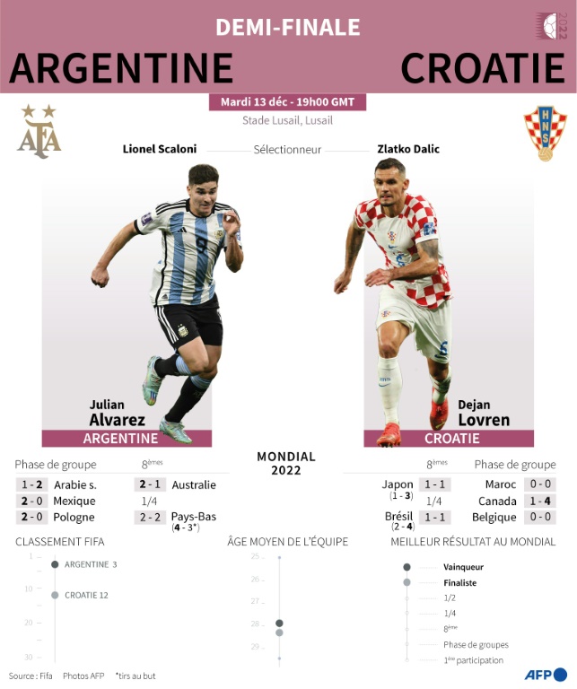 L'Argentine évolue comme à la maison sous les dorures du stade de Lusail où elle dispute son quatrième match, portée par ses milliers de supporters, et où elle espère revenir dimanche pour la finale (16h00). Mais pour y parvenir, il faut que Messi, N.10 de l'Albiceleste, domine Modric, N.10 des Vatreni.