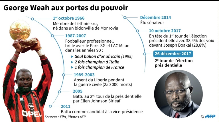 George Weah, 51 ans, favori après être sorti vainqueur du premier tour du 10 octobre avec plus de 38% des voix, s'est montré sûr de lui avant et après le jour de l'élection. "Le peuple libérien a clairement fait son choix (mardi) et, ensemble, nous sommes confiants quant à l?issue du processus électoral", a tweeté le Ballon d'Or 1995 mercredi.