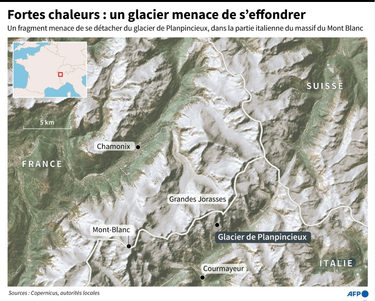 Comme un immense sérac, un volume de glace estimé à 500.000 mètres cubes - soit la "taille de la cathédrale de Milan" - menacerait de s'ébouler, selon les autorités locales, qui ont ordonné mercredi soir l'évacuation durant 72 heures d'une "zone rouge" en contrebas.