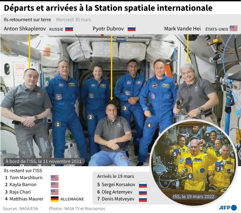 La capsule Soyouz MS-19, qui transporte les Russes Anton Chkaplérov et Piotr Doubrov, ainsi que l'Américain Mark Vande Hei, s'est détachée de l'ISS à 07H21 GMT comme prévu, a indiqué l'agence spatiale russe Roscosmos. L'atterrissage doit avoir lieu à 11H28 GMT dans le Sud-Est du Kazakhstan, selon la même source.