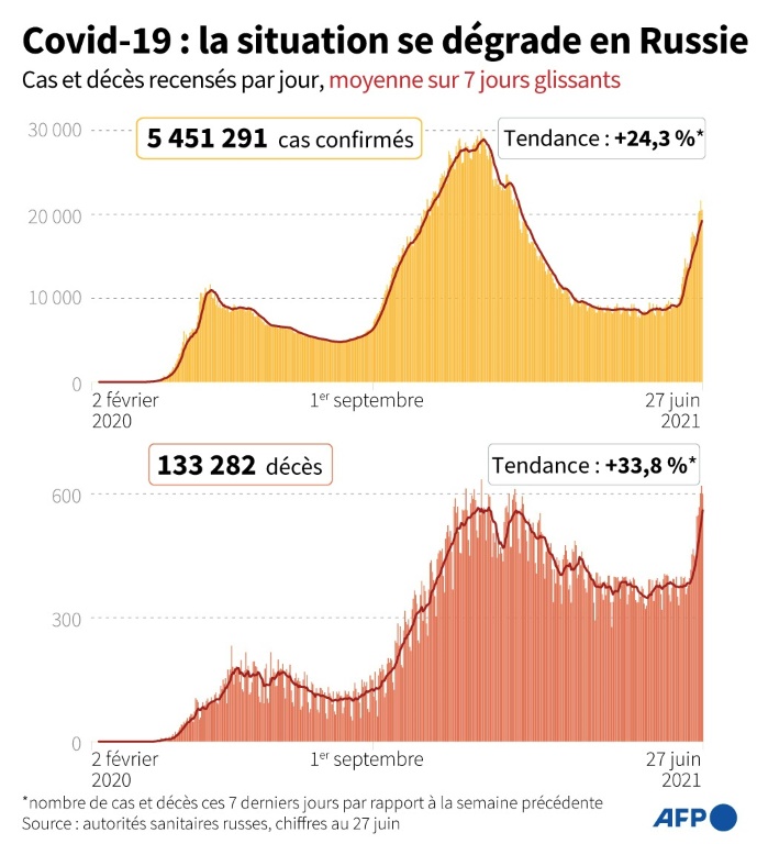 La capitale russe ne parvient pas à juguler le coronavirus malgré des restrictions renforcées ces dernières semaines --avec l'arrivée d'un pass sanitaire lundi--, recensant des records successifs de décès tandis que le variant Delta poursuit son essor planétaire au grand dam de pays impatients de retrouver une vie normale.