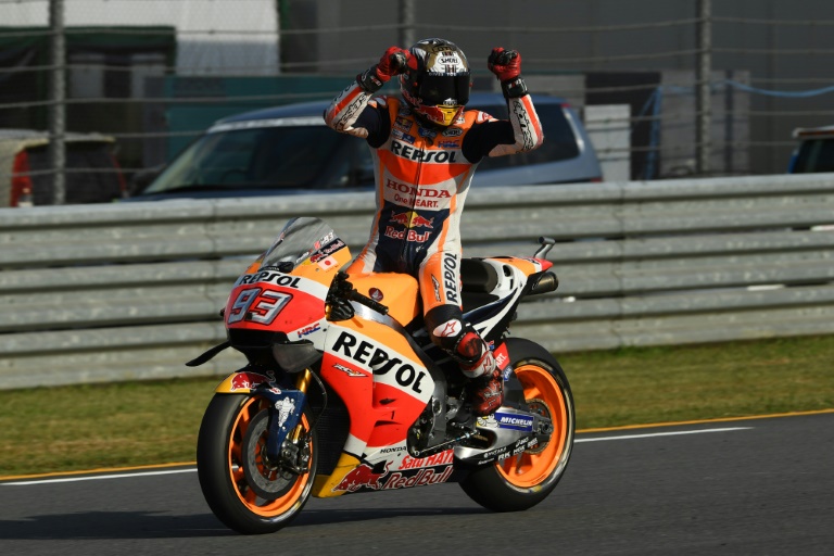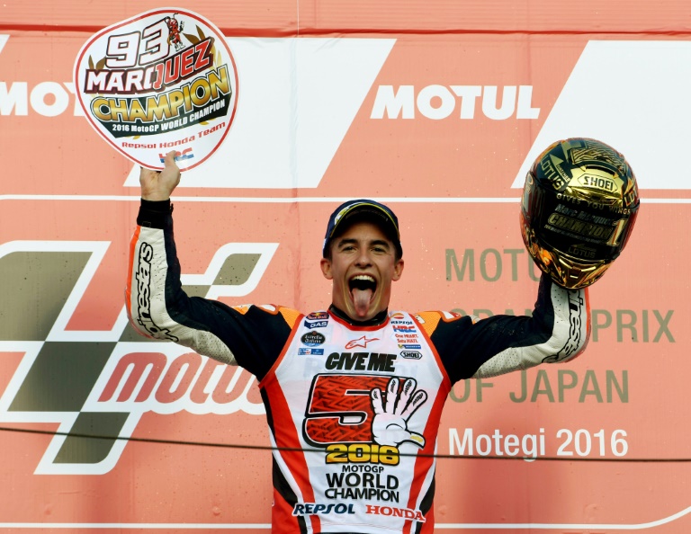 Marquez, 23 ans, a terminé la course devant Andrea Dovizioso (Ducati) et Maverick Vinales (Suzuki), et profité dans la quête du titre des chutes des pilotes Yamaha Valentino Rossi, pourtant parti de la pole position, et Jorge Lorenzo. Marc Marquez a été sacré champion en 125cc (2010) puis Moto2 (2012) et MotoGP (2013, 1014, 2016).