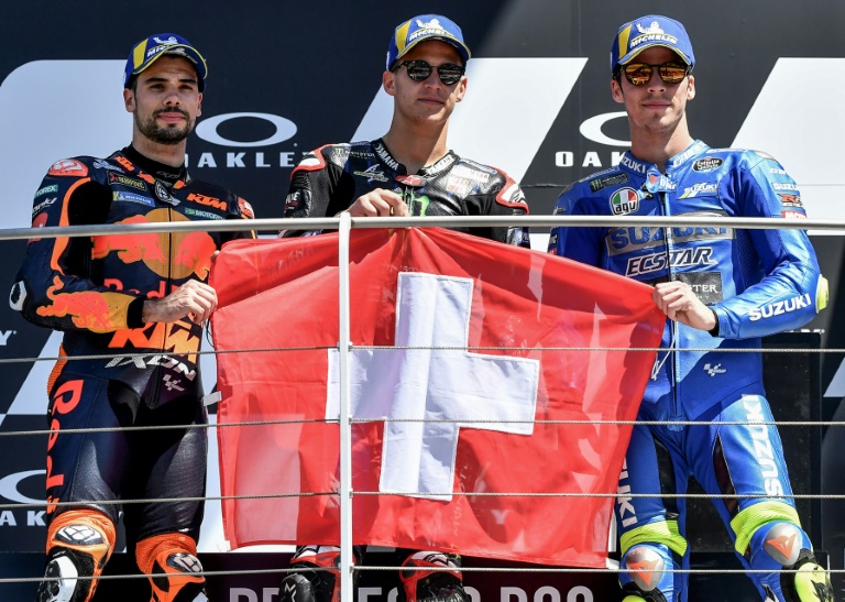 La ligne d'arrivée franchie, le Français de Yamaha a pointé sur son casque le numéro et le nom du Suisse, victime d'un grave accident samedi lors des qualifications de la Moto3, avant de se draper du drapeau helvétique plutôt que français à sa descente de moto, l'emmenant avec lui sur le podium.