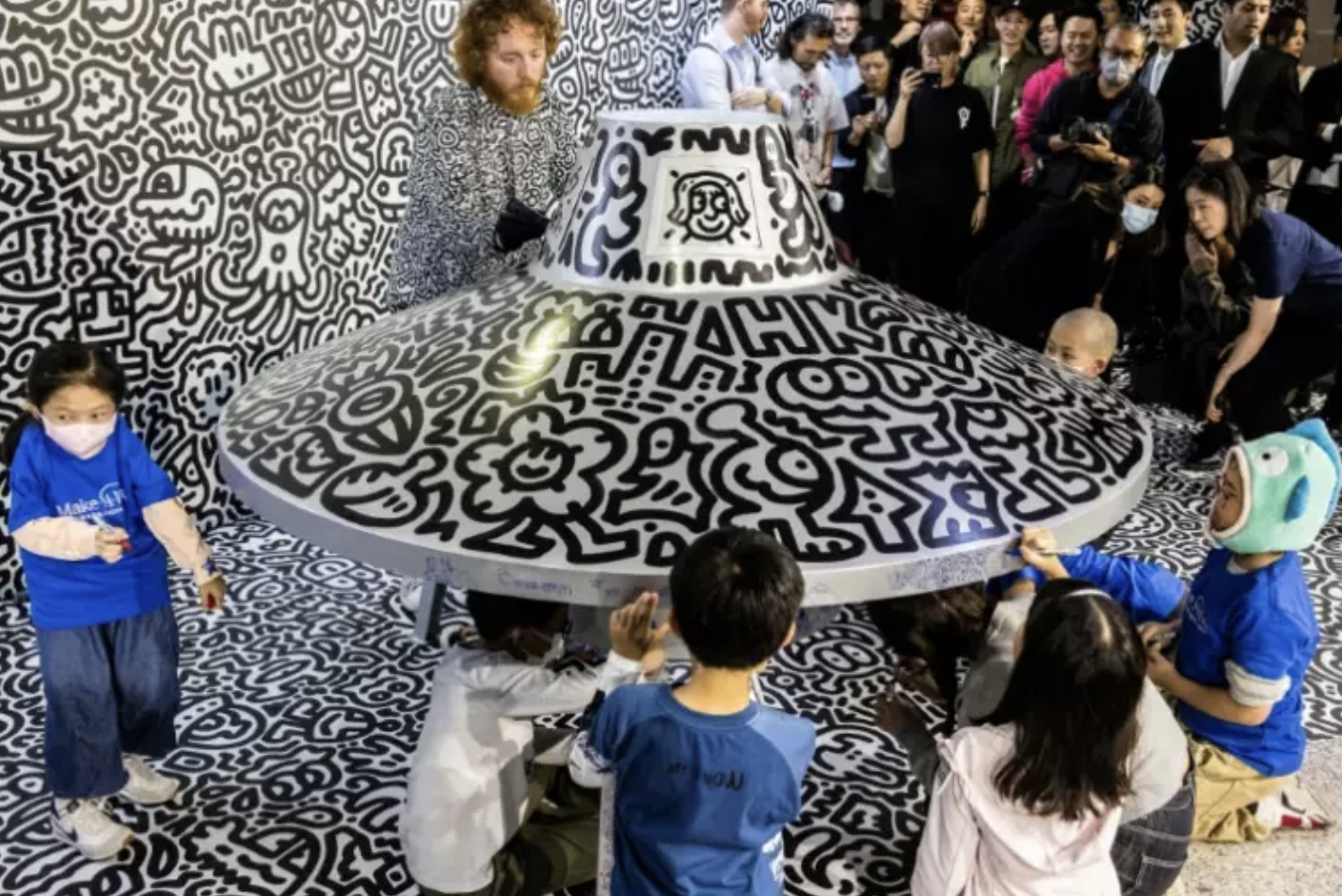 Mais pour "Mr Doodle dans l'espace" - une exposition lancée jeudi dernier - son équipe a habillé les murs de sa galerie dans le style caractéristique de l'artiste, enveloppant ses toiles d'un éclatant embrouillamini de gribouillages.