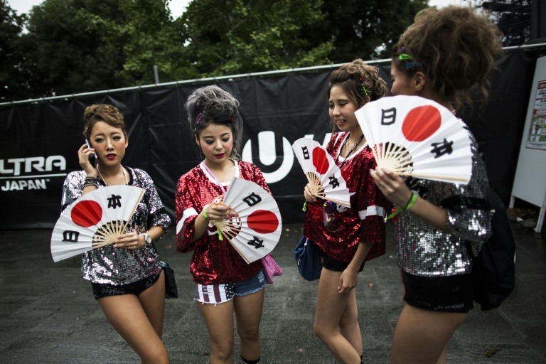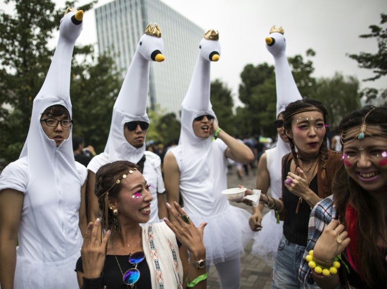 Dehors sous la pluie battante, la masse dense de jeunes "Ultranautes" japonais, dont beaucoup dans les tenues les plus folles, ne pense qu'à faire la fête.