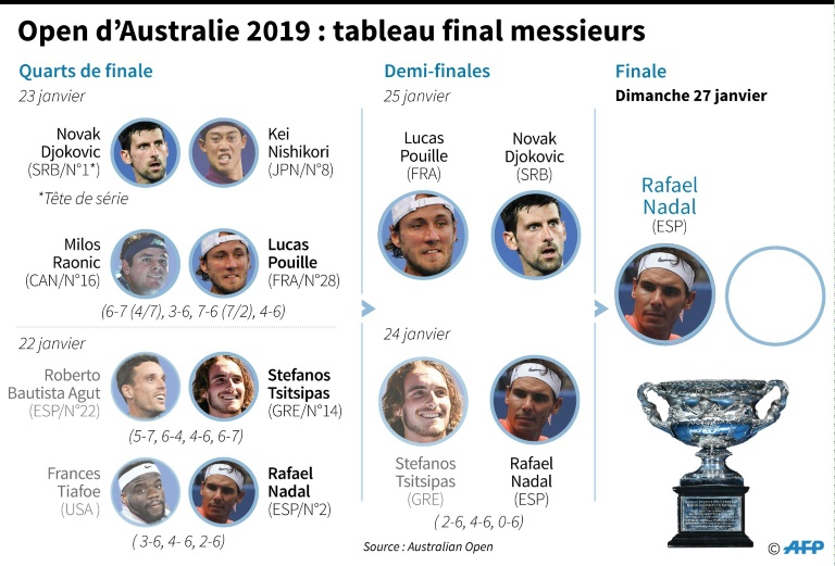 Rafael Nadal a désamorcé la menace Stefanos Tsitsipas (15e) en moins de deux heures en demi-finales de l'Open d'Australie, jeudi à Melbourne, où la finale dames opposera la Japonaise Naomi Osaka à la Tchèque Petra Kvitova avec un double enjeu, le trophée et le trône de N.1 mondiale.