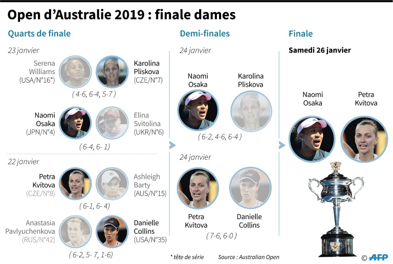 Avant d'être couronnée à l'US Open, Osaka, née d'une mère japonaise et d'un père haïtien, s'était révélée au printemps dernier en s'offrant le prestigieux tournoi d'Indian Wells après avoir entamé la saison 2018 autour de la 70e place mondiale. Kvitova (N.6), elle, a mis fin (7-6 (7/2), 6-0) à la belle aventure de l'Américaine Danielle Collins (35e), venue sur le tard sur le circuit après avoir privilégié ses études et qui n'avait remporté aucun match en Grand Chelem en cinq tentatives avant la quinzaine australienne. A 28 ans, deux ans après une agression au couteau à son domicile qui avait menacé sa carrière, la gauchère tchèque va jouer sa troisième finale en Grand Chelem. Elle a remporté les deux premières, à chaque fois à Wimbledon, en 2011 et en 2014. Son agression, survenue en décembre 2016 au cours d'un cambriolage, avait rendu nécessaire une importante opération de sa main gauche et l'avait éloignée des courts pendant cinq mois. Kvitova a retrouvé toute sa superbe à Melbourne : elle n'a pas concédé le moindre set et a même perdu moins de cinq jeux en moyenne par match. Titrée à Sydney début janvier, la voilà sur une série de onze victoires consécutives.
