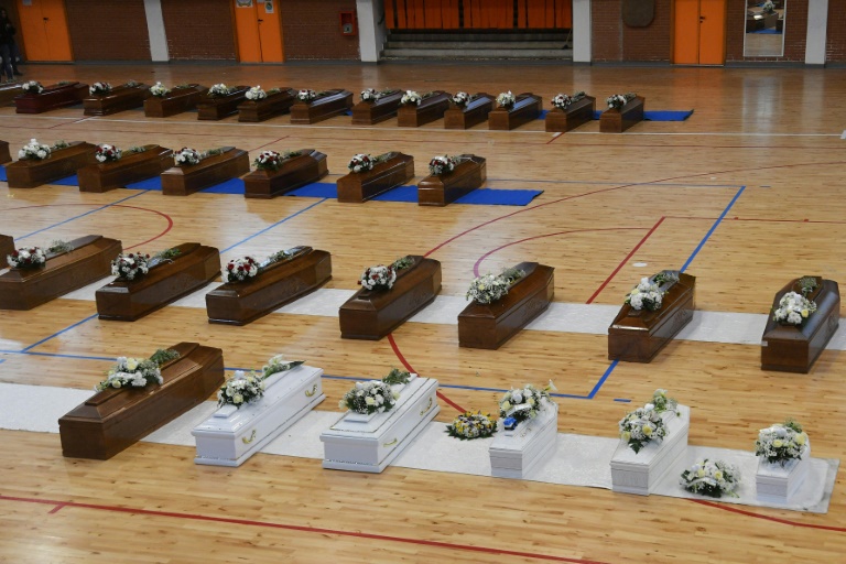 A Crotone, des femmes en pleurs sont conduites à l'intérieur de la chapelle ardente entre les rangs de cercueils installés sur le parquet du PalaMilone, le centre sportif de cette ville de près de 60.000 habitants située en Calabre, le talon de la botte italienne.