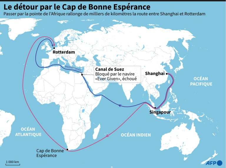 Selon Lloyd's list, le porte-conteneurs coincé bloque chaque jour l'équivalent d'environ 9,6 milliards de dollars (8,1 milliards d'euros) de marchandises. Le géant du transport maritime Maersk et l'allemand Hapag-Lloyd ont indiqué jeudi qu'ils envisageaient de dérouter leurs navires et de passer par le Cap de Bonne-Espérance, soit un détour de 9.000 kilomètres et au moins sept jours supplémentaires autour du continent africain.