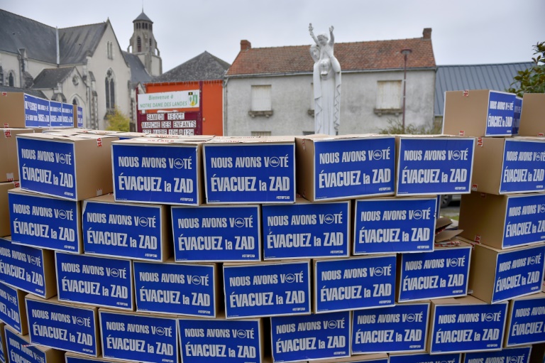 "Nous avons voté. Evacuez la Zad", proclamaient les affichettes collées sur les cartons, en référence à la consultation locale organisée dans le département le 26 juin, qui a vu la victoire du "oui" au transfert de l'actuel aéroport nantais à une vingtaine de kilomètres plus au nord.