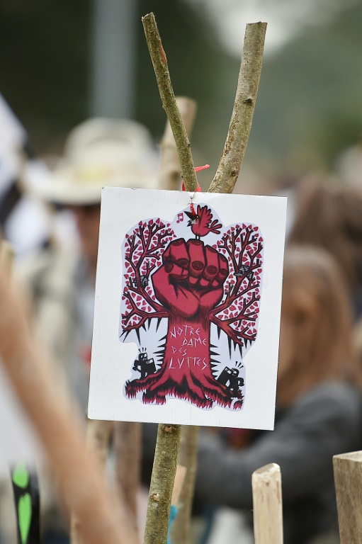 Parmi les pancartes brandies par les uns et les autres, on peut lire "Ni travaux, ni expulsions" ou "Touche pas à mon campagnol". Sur la route, des manifestants chantent "Des bâtons, pas des avions!" ou scandent "Nous sommes là, nous serons là", tout en frappant le sol de leurs bâtons, interrompus de temps à autre par la rumeur d'un hélicoptère de la gendarmerie qui survole la Zad.