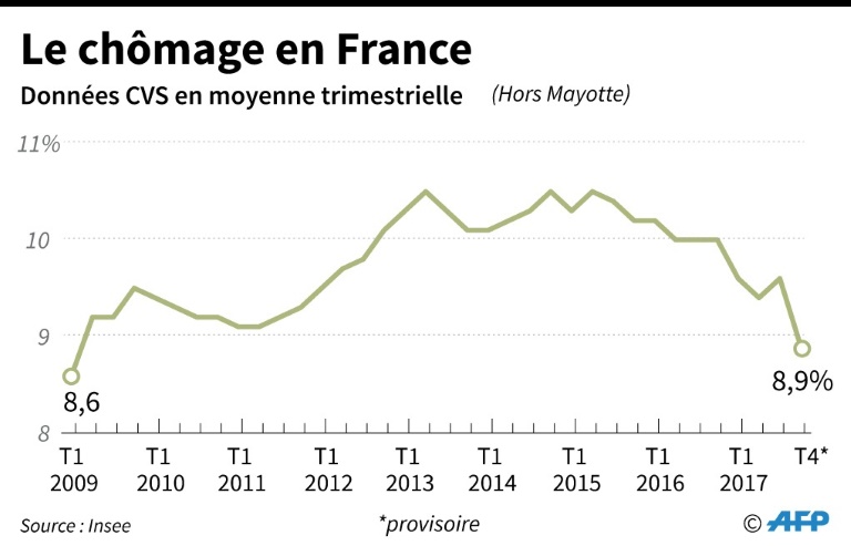 Le recul du taux de chômage est net fin 2017: il est passé sous la barre des 9% au quatrième trimestre poursuivant une décrue entamée depuis 2016 et profitant enfin du regain de croissance que connaît la France.