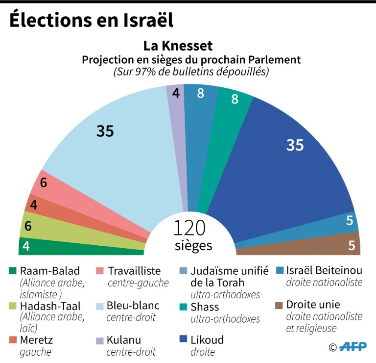 Tout autre choix que celui de M. Netanyahu ferait sensation. Entre les 35 mandats du Likoud et ceux de ce qu'il appelle ses "partenaires naturels", M. Netanyahu est en mesure de réunir 65 sièges sur 120, selon un décompte presque final des votes. Son principal concurrent, le général Benny Gantz, à la tête de la liste de centre droit "Bleu-blanc", est loin de pouvoir prétendre à la majorité absolue.