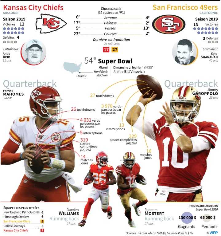 Car ces 49ers ont d'autres atouts, avec le running back Raheem Mostert, auteur de quatre touchdowns en finale de conférence face à Green Bay (37-20), et une défense hermétique menée par le rookie Nick Bosa et le vétéran Richard Sherman.