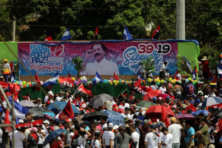Lors de cette cérémonie anniversaire, les participants ont brandi des drapeaux rouges et noirs, aux couleurs du Front sandiniste de libération nationale (FSLN, gauche). La foule a scandé "Non, il ne part pas, il reste". "Nous sommes venus affirmer une fois de plus que le peuple soutient Daniel (Ortega) et que le FSLN est l'unique option qui s'occupe des intérêts du peuple", a déclaré Alina Manzanares, 51 ans, à l'AFP.