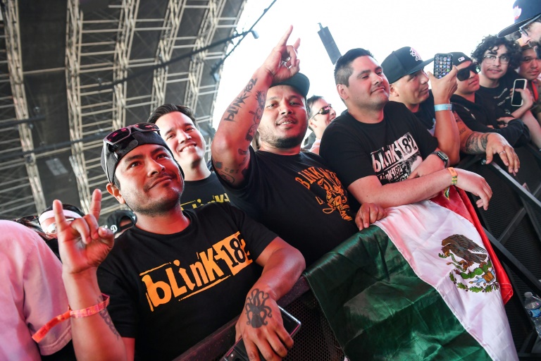 Tous approchant ou dépassant la cinquantaine, les musiciens de Blink-182 - Travis Barker, Mark Hoppus et Tom DeLonge - ont enflammé l'assistance avec leurs tubes "Rock Show", "What's My Age Again", "I Miss You" ou "All The Small Things", repris en choeur par les spectateurs.