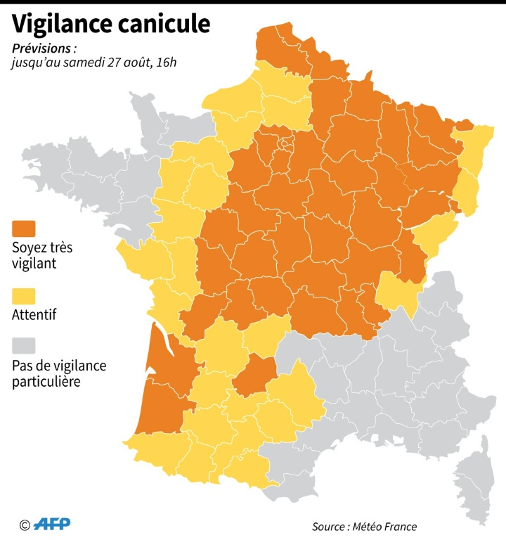 La vigilance orange Canicule concernait toujours 43 départements, entre le Sud-Ouest et le Nord et l'Est du pays, mais avec un risque d'ondées et d'orages sur le Nord et le Nord-est du pays, a annoncé Météo France.