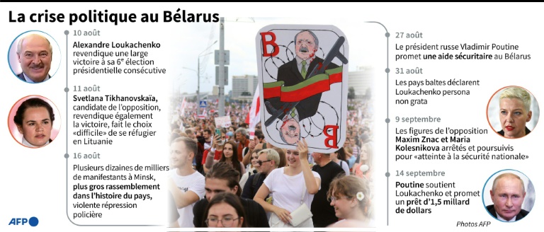 Le président Alexandre Loukachenko refuse catégoriquement de s'incliner et a demandé l'aide de son homologue russe Vladimir Poutine, qui a promis un soutien sécuritaire à Minsk si nécessaire et promis au Bélarus un prêt de 1,5 milliard de dollars.
