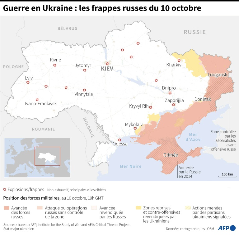 Des représailles à l’attaque, “terroriste” selon Vladimir Poutine, qui a endommagé samedi le pont reliant la Russie à la Crimée (sud), péninsule annexée par Moscou en 2014. Symbolique et stratégique, ce viaduc routier et ferroviaire sert à l’approvisionnement russe dans le Sud ukrainien où Kiev mène une contre-offensive.