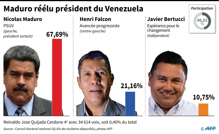 Lors d'un scrutin critiqué par la communauté internationale et boycotté par l'opposition qui dénonçait une "supercherie", M. Maduro, 55 ans, a obtenu 68% des voix contre 21,2% à son principal adversaire Henri Falcon, 56 ans. Ce dernier a dénoncé un scrutin sans "légitimité" et réclamé une nouvelle élection avant la fin de l'année.