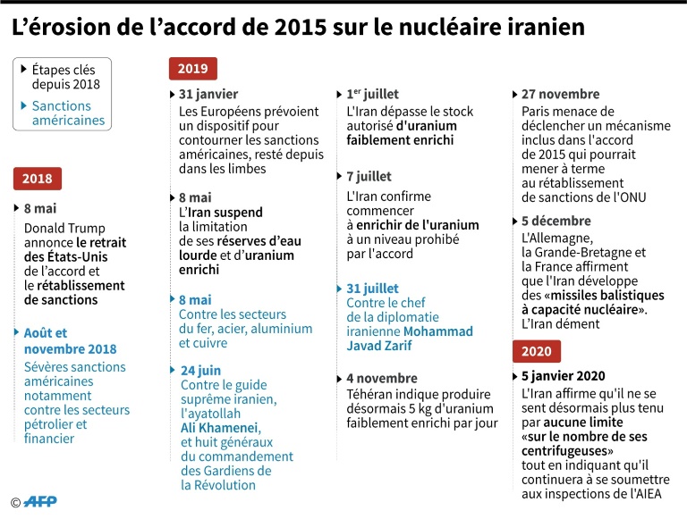 Le 5 janvier, Téhéran avait annoncé la "cinquième et dernière phase" de son plan de réduction de ses engagements, en riposte à la sortie des Etats-Unis de l'accord en 2018 et au rétablissement de lourdes sanctions américaines qui étranglent son économie.