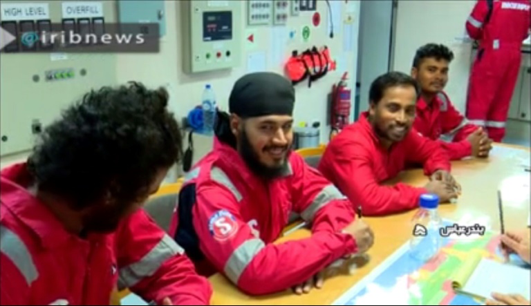 La télévision iranienne a diffusé mardi des images de l'équipage du Stena Impero retenu à bord du navire au large du port de Bandar Abbas (sud). On voit les 23 hommes, majoritairement indiens, assis autour d'une table ou s'adonnant à des tâches quotidiennes.