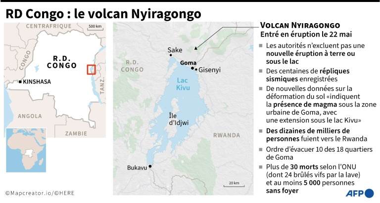 Les risques sont désormais de quatre types, selon les autorités: les tremblements de terre à répétition, la toxicité de l'air et de l'eau du fait des cendres dispersées dans l'atmosphère, une "éruption secondaire" avec possiblement des laves surgissant directement du sol dans la ville. Et enfin le "scénario catastrophe" de l'explosion d'une "poche de gaz sous le lac Kivu, du fait d'un contact avec le magma".