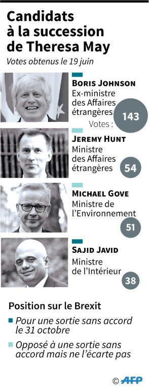 Le résultat des deux derniers rounds prévus jeudi doit être annoncé vers 17H00 GMT. Face à Boris Johnson, intouchable, trois candidats se disputent la deuxième place: les ministres des Affaires étrangères Jeremy Hunt, de l'Environnement Michael Gove, et de l'Intérieur Sajid Javid.