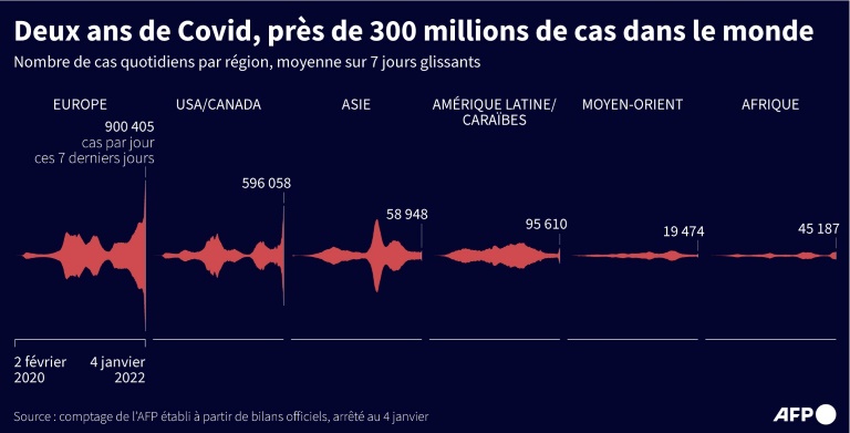 Les Etats-Unis, le pays le plus endeuillé du monde avec plus de 832.000 morts, ont enregistré mercredi près de 600.000 nouveaux cas. Le variant Omicron est devenu ultra-majoritaire dans le pays.