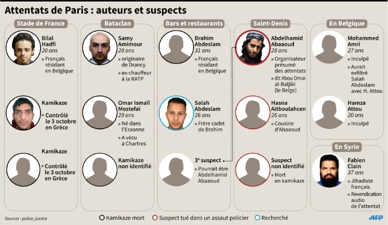 En France, l'enquête a accrédité l'hypothèse de la participation directe aux attaques du jihadiste belgo-marocain Abdelhamid Abaaoud: il a été filmé le soir des attentats dans une station de métro à l'est de Paris, où a été retrouvée une voiture utilisée par les tueurs qui ont mitraillé les terrasses de cafés et de restaurants, et des analyses ont montré qu'il avait manipulé une kalachnikov retrouvée dans le véhicule.