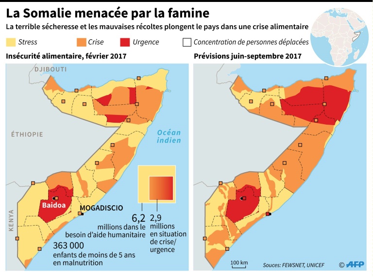 Le nouveau président somalien Mohamed Abdullahi Mohamed a qualifié le mois dernier de "catastrophe nationale" la grave sécheresse qui ravage son pays. L'Organisation mondiale de la santé (OMS) estime que plus de 6,2 millions de Somaliens - la moitié de la population - ont besoin d'une aide humanitaire d'urgence, dont près de trois millions qui souffrent de la faim.