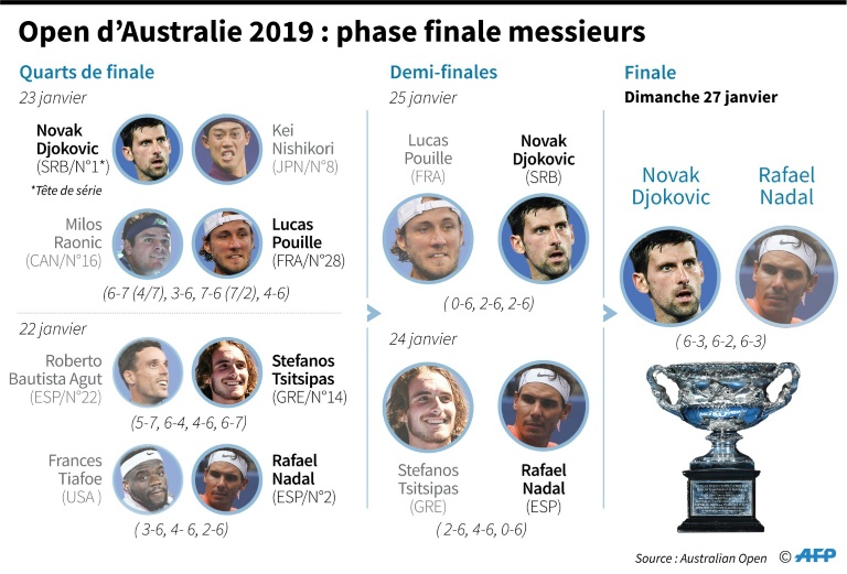 A Tiafoe en quarts de finale, le Majorquin de 32 ans n'a laissé que neuf jeux. A Tsitsipas en demi-finale, seulement six. Le Canadien Denis Shapovalov (25e), au troisième tour, et le Russe Daniil Medvedev (16e), en huitièmes de finale, ont bien chipé chacun un set à Djokovic. Mais aucun d'entre eux n'a trouvé les moyens d'empêcher les retrouvailles au sommet entre les N.1 et N.2 mondiaux en finale.