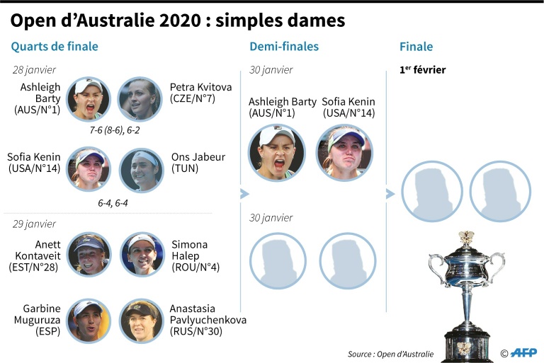 Dans le tableau féminin, Barty, 23 ans et lauréate de son premier tournoi du Grand Chelem l'an dernier à Roland-Garros, a pris sa revanche sur la Tchèque Petra Kvitova (7e) qui l'avait battue au même stade des quarts l'an dernier à Melbourne avant d'atteindre la finale.