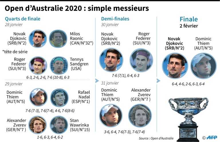 Djokovic a rendu sa justice et elle est implacable: le Serbe a battu dimanche en 5 sets Dominic Thiem pour remporter son 8e Open d'Australie et son 17e titre du Grand Chelem, à trois longueurs désormais du record de Roger Federer (20).