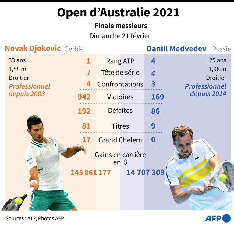 Après avoir poussé Rafael Nadal au cinquième set pour sa première finale majeure, à l'US Open 2019, Medvedev s'attaque cette fois au N.1 mondial. Djokovic jouera lui sa neuvième finale à Melbourne et visera un 18e sacre en Grand Chelem qui le rapprocherait du record de vingt trophées co-détenu par Roger Federer et Rafael Nadal.