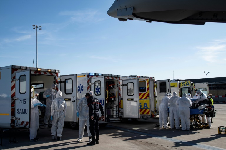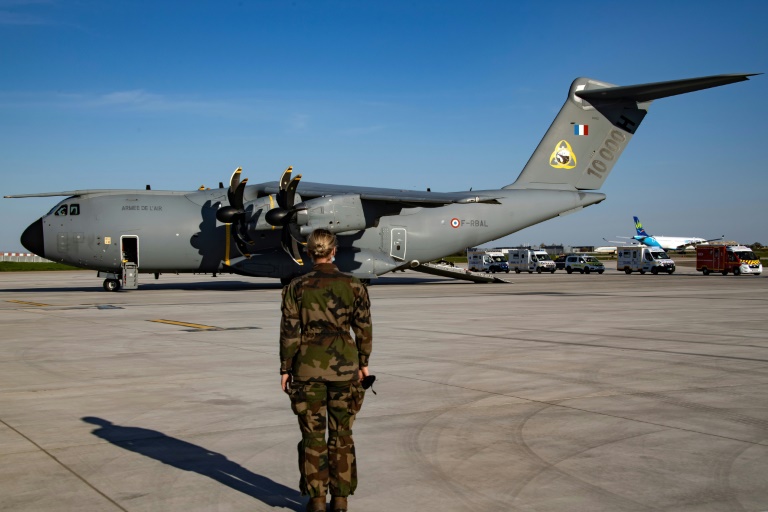 Entre deux rangées d'avions de ligne cloués au sol par le coronavirus, un A400 de l'armée de l'air attend des patients: l'aéroport d'Orly s'est mis au service de l'évacuation de malades atteints du Covid-19 pour désengorger les hôpitaux d'Ile-de-France.