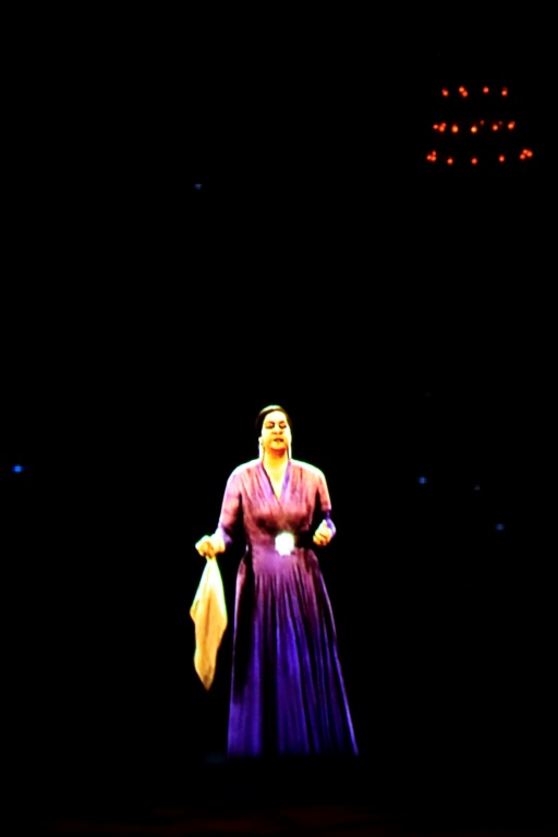 Au lever du rideau sur la scène de la grande salle de l'Opéra, celle que l'on surnommait "L'Astre de l'Orient" ou la "quatrième pyramide", s'est matérialisée en trois dimensions dans une robe violette brillante, arborant son célèbre foulard à la main. Immédiatement, la salle pleine à craquer, d'une capacité d'un millier de personnes, a offert une immense ovation.