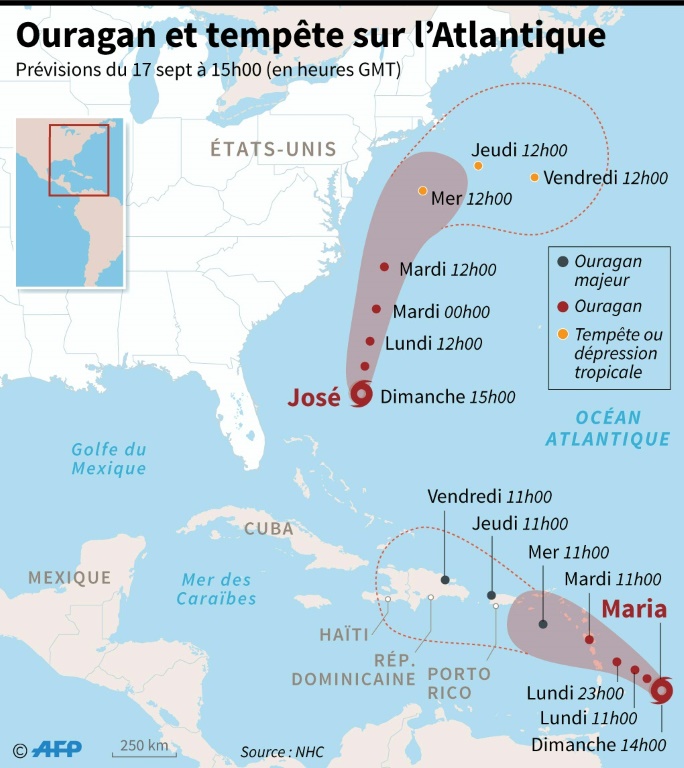 "Dès ce lundi 18 septembre, Météo-France prévoit pour la Guadeloupe une forte houle, des vents violents, avec rafales jusqu'à 200 km/h, de fortes pluies pouvant aller jusqu'à 400 mm par endroit", a fait savoir la préfecture dans un communiqué à la mi-journée. Les Iles du nord, Saint-Martin et Saint-Barthélemy, déjà ravagées début septembre par l'ouragan Irma, restent pour leur part en vigilance jaune cyclone, selon la préfecture.