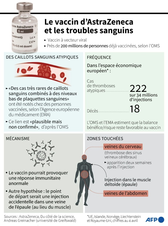 Jeudi, plusieurs pays ont annoncé limiter les injections du vaccin d'AstraZeneca au lendemain de rapports confirmant un lien avec de rares mais graves cas de caillots sanguins: les Philippines ont suspendu son utilisation pour les moins de 60 ans, l'Australie pour les moins de 50 ans.