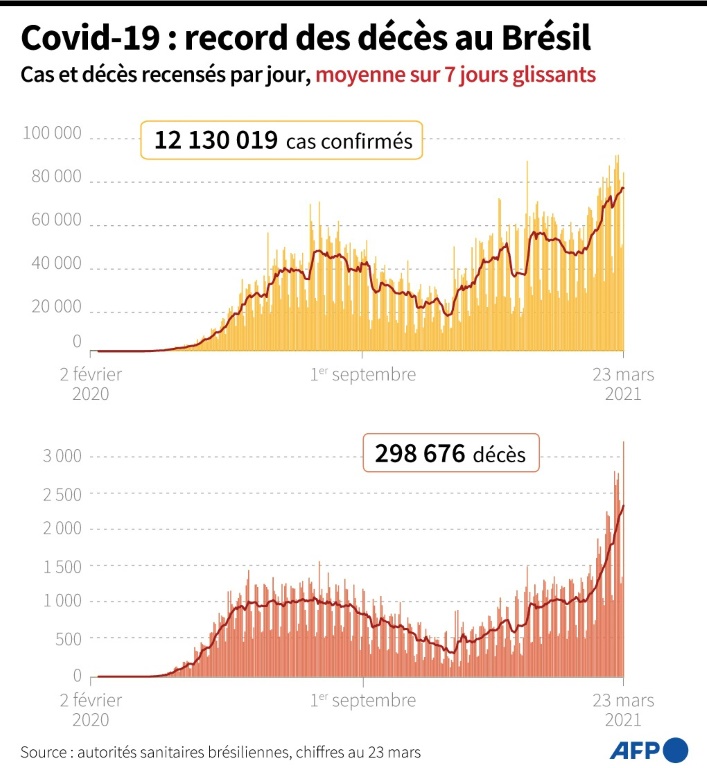 Le président d'extrême droite Jair Bolsonaro subit des pressions de toutes parts pour enfin s'attaquer à la pandémie désormais hors de contrôle : 23 des 27 Etats du pays font état d'un taux d'occupation de 85% de leurs unités de soins intensifs et de pénuries d'oxygène.