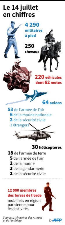 Le président Emmanuel Macron, dont c'est le deuxième défilé depuis son élection en mai 2017, descendra vers 10h00 (08H00 GMT) la célèbre avenue parisienne à bord d'un "command car", avant de rejoindre la tribune présidentielle place de la Concorde d'où il assistera aux festivités.