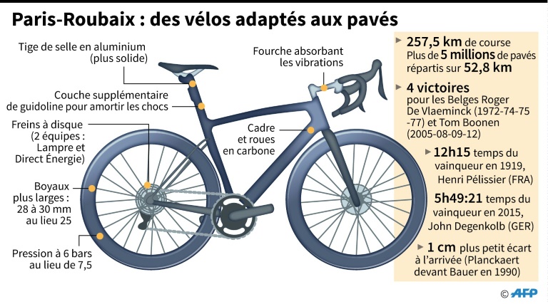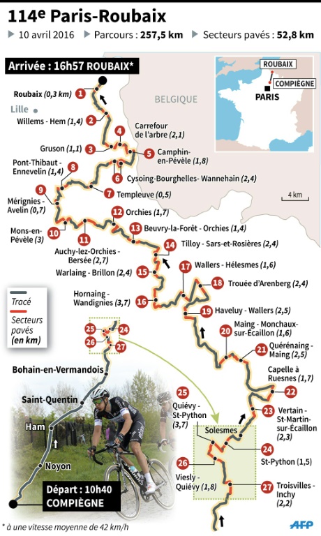 Pour jouer la victoire sur le vélodrome de Roubaix, au bout d'un épuisant parcours de 257,5 kilomètres, il faut franchir 27 secteurs pavés (52,8 km). Sortir sans encombre de la trouée d'Arenberg où le danger rôde partout, figurer en bonne position à Mons-en-Pévèle, autre lieu de perdition, surmonter enfin les périls de l'affreux Carrefour de l'Arbre, le troisième secteur "cinq étoiles" à l'approche des 12 derniers kilomètres.