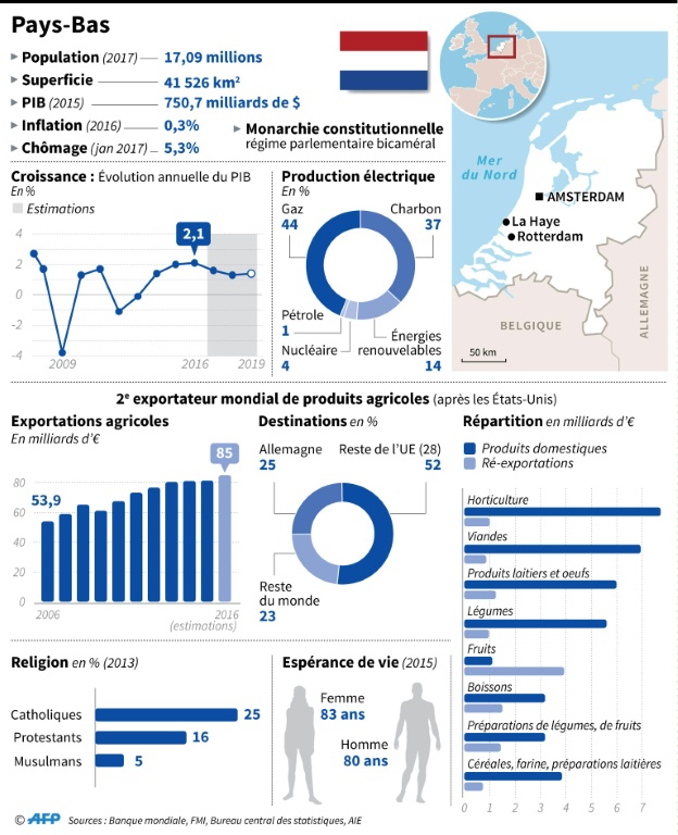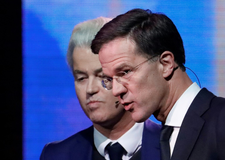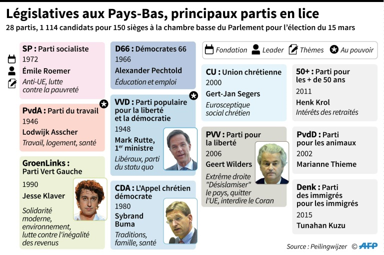 Selon la dernière étude du site de référence Peilingwijzer publiée lundi, le Parti populaire libéral et démocrate (VVD) du Premier ministre Mark Rutte, toujours en tête, est crédité de 24 à 28 sièges sur les 150 que compte la chambre basse du Parlement, loin des quarante dont il dispose actuellement. Candidat à un troisième mandat à la tête du pays de 17 millions d'habitants, Mark Rutte dit "se battre très fort" pour repousser son rival anti-système, anti-islam et anti-immigration.