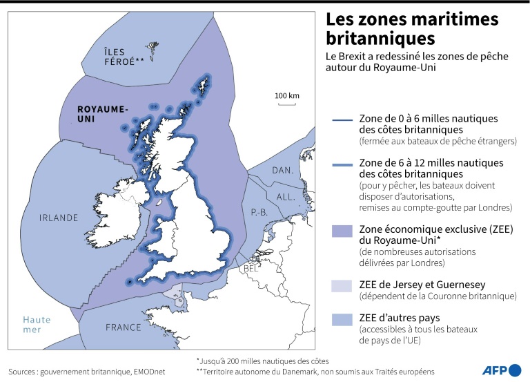 L'accord post-Brexit, conclu in extremis fin 2020 entre Londres et Bruxelles, prévoit que les pêcheurs européens puissent continuer à travailler dans certaines eaux britanniques à certaines conditions.