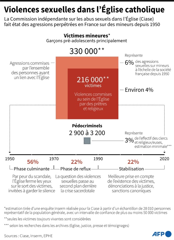 Début octobre, François avait exprimé sa "honte" après les révélations choc de la Ciase, qui a estimé à 330.000 le nombre de personnes de plus de 18 ans ayant fait l'objet de violences sexuelles en France depuis 1950, quand elles étaient mineures, de la part de clercs, religieux ou personnes en lien avec l'Eglise.