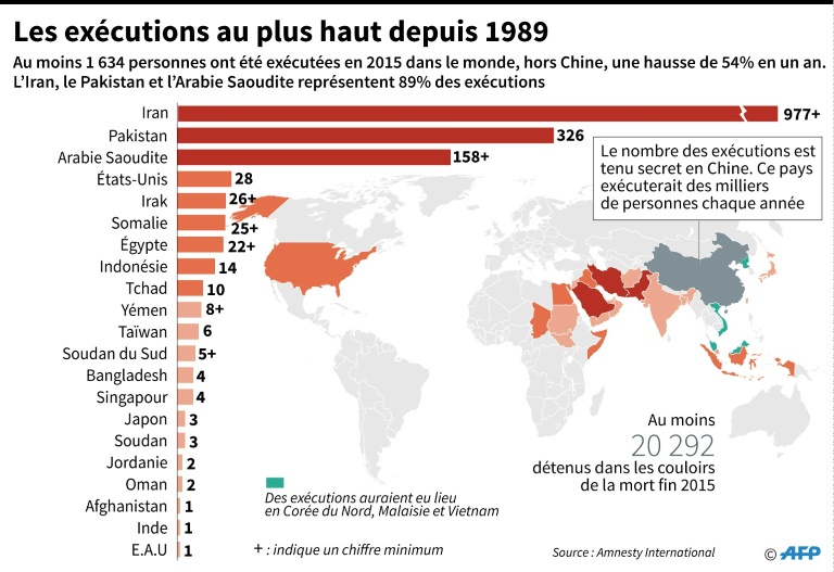 Dans son rapport annuel sur la peine de mort, Amnesty chiffre à "au moins 1.634" le nombre d'exécutions dans le monde en 2015, soit une hausse de 54% par rapport à 2014. Ces exécutions, recensées dans 25 pays, sont concentrées à 89% dans trois d'entre eux: l'Iran avec au moins 977 exécutions, le Pakistan avec 326 et l'Arabie saoudite avec au moins 158. Viennent ensuite les États-Unis (28).