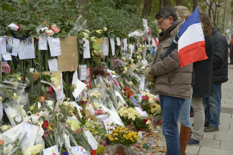 A quelques mètres de là , des dizaines de femmes, d'hommes et parfois d'enfants se recueillent quelques instants devant les centaines de fleurs et de petits mots qui s'amoncellent sur le trottoir devant le bar La Belle Equipe, où 19 personnes ont été mitraillées par les jihadistes.